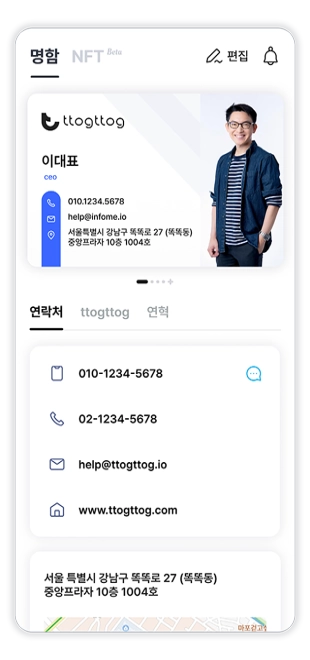 연락처 정보뿐 아니라 나와 기업의 홍보 콘텐츠나 주력 상품을 업로드하고 명함과 함께 전달하세요. 사진, 동영상, 문서, 웹 링크 등 다양한 유형의 콘텐츠를 등록할 수 있습니다.